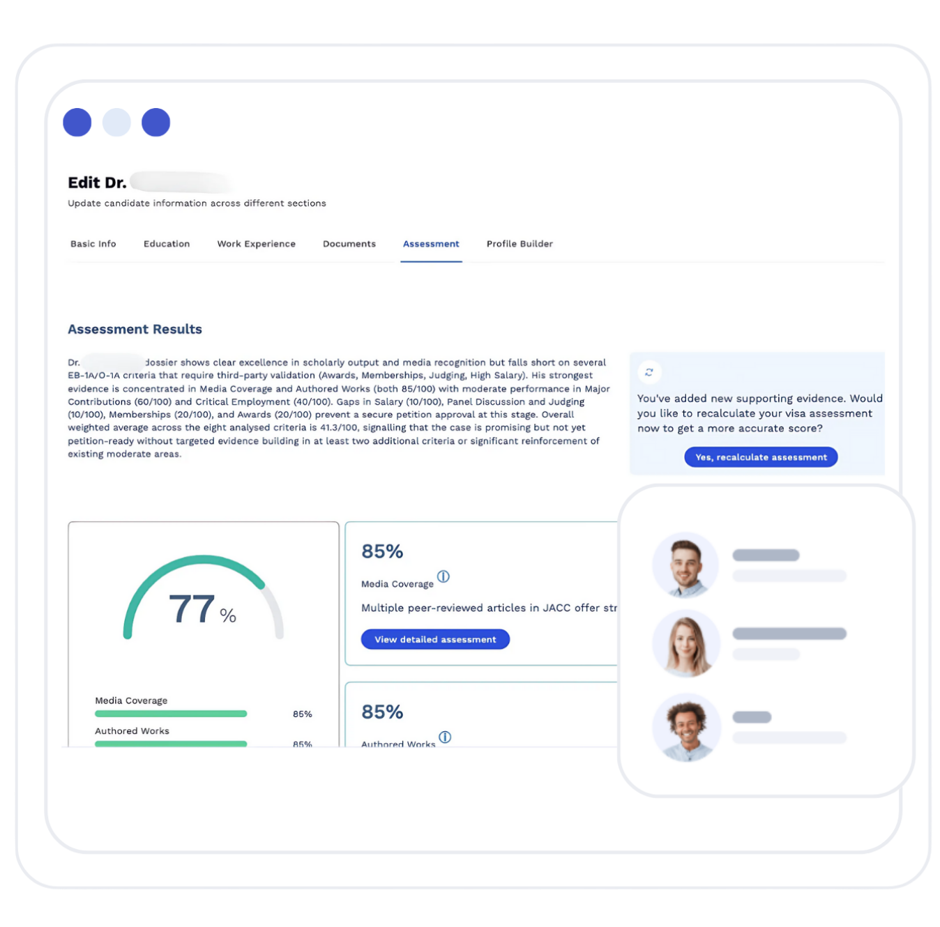 Quickly see which cases are strong, which have risks, and what next steps are needed. BeyondH1B’s smart assessment